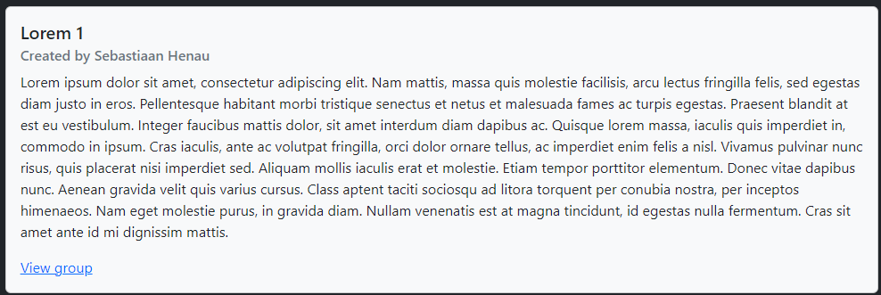 Schrijf een nieuwe component GroupItem, deze component krijgt een groep binnen en toont hiervoor de basisinformatie (titel, eigenaar, beschrijving en link naar een detailpagina). Onderstaande code geeft je een idee van de structuur van een groep. De component is gebouwd met de Bootstrap Card component.
