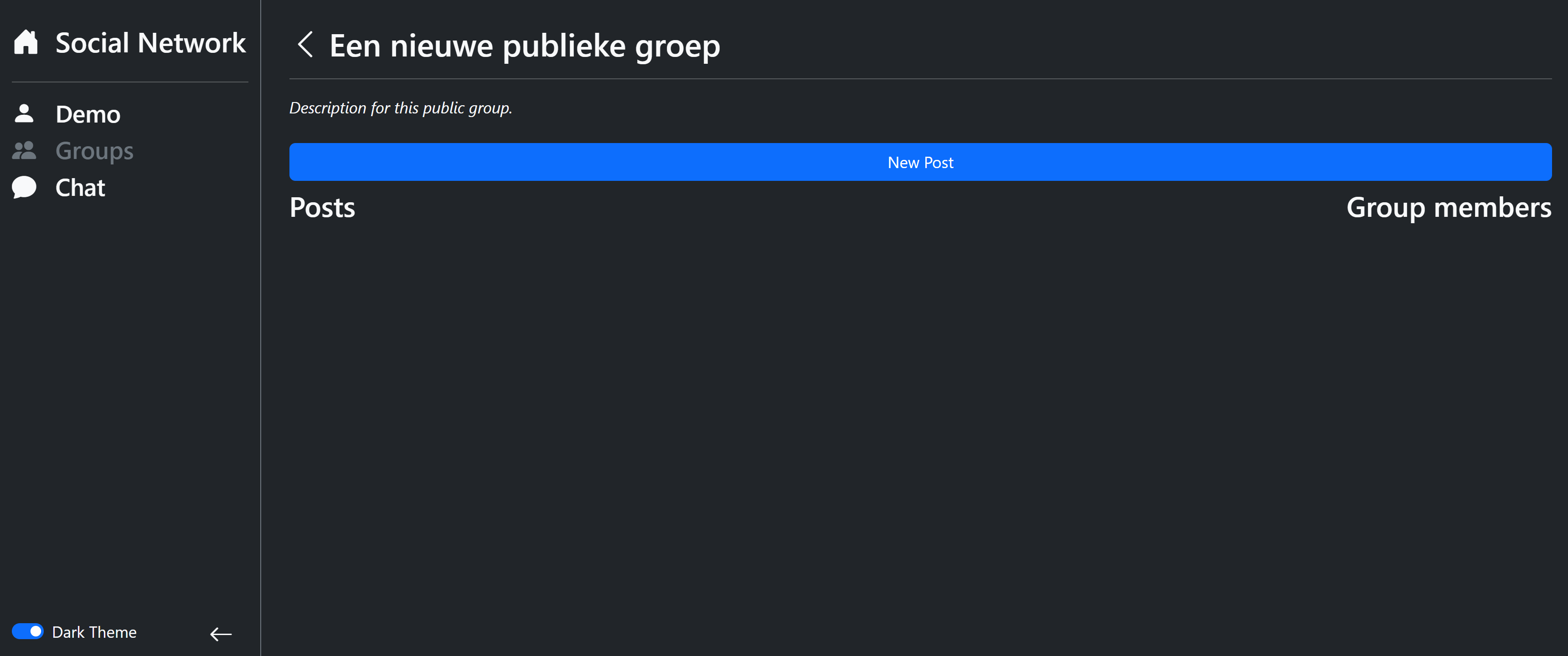 De detailpagina voor een groep kan gebruikt worden om de posts en de leden van een groep te bekijken, daarnaast kan een gebruiker zich hier ook in- of uitschrijven in de groep (als deze publiek is). De eigenaar van de groep kan de leden van de groep aanpassen.