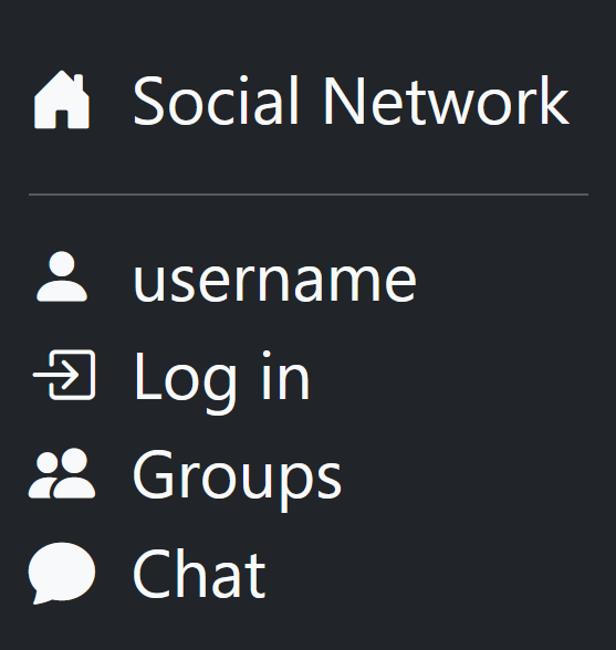 Gebruik een component NavItem die één link voorstelt. Als het NavItem de titel van de website is ("Social Network"), dan wordt er een horizontale lijn getoond onder de titel en het icoontje, daarnaast wordt een <h3> gebruikt voor het icoontje en de titel. Alle andere NavItem componenten gebruiken een <h4>. Bekijk de Bootstrap Icons documentatie voor meer info over het gebruik van de icoontjes. Onderstaande lijst geeft weer welke links in elk element in de SideNav moet staan en welk icoon gebruikt wordt.