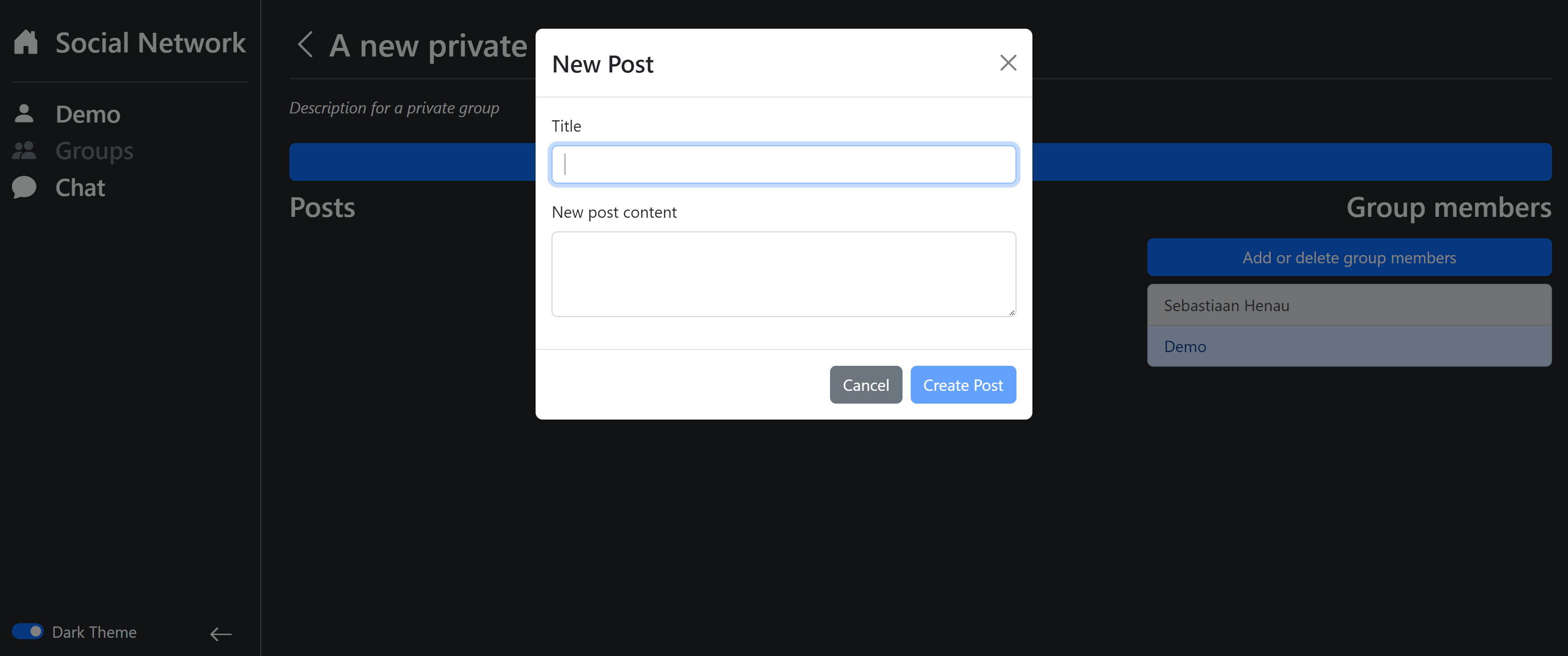 Om een nieuwe post aan te maken wordt gebruik gemaakt van de React Bootstrap Modal component gebruikt. Zodra de gebruiker op de "New Post" knop drukt, wordt een modaal venster met 2 formulierelementen getoond. Het eerste veld wordt gebruikt om de titel van de nieuwe post in te geven, het tweede veld wordt gebruikt om de inhoud van de post in te geven. Het eerste inputveld wordt automatisch gefocust. De create knop is pas actief als zowel de titel als de inhoud ingegeven zijn.