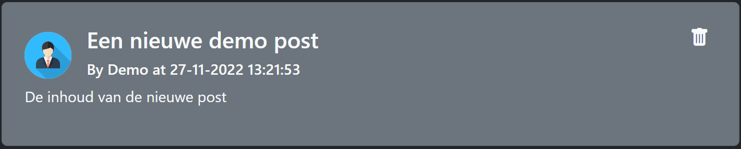 Een post ziet er als volgt uit. De delete knop van de post mag enkel zichtbaar zijn voor de eigenaar van de post. Gebruik ook voor de delete functionaliteit een optimistische update. Als er op de post gedrukt wordt, wordt je naar een detailpagina gebracht. Je kan gebruik maken van de event.stopPropagation() functie om ervoor te zorgen dat de de detailpagina niet geopend wordt als de gebruiker op het delete icoon drukt.