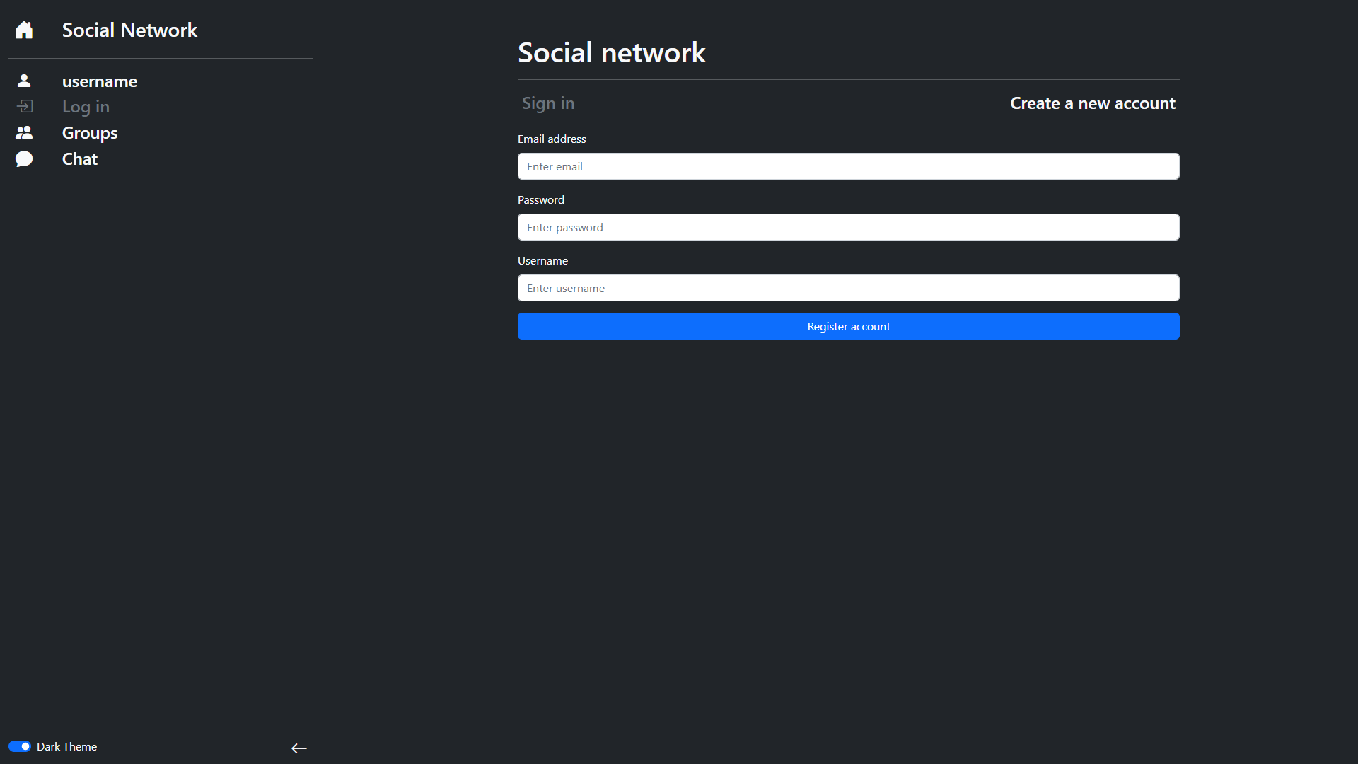 Als het formulier in registreer modus staat, worden dezelfde formulierelementen getoond, maar wordt er ook een formulier getoond om de gebruiksnaam in te geven. Merk op dat de tekst op de submit knop aangepast wordt. Ook de knoppen bovenaan worden aangepast, de optie die niet geselecteerd is krijgt de CSS-klasse text-muted.