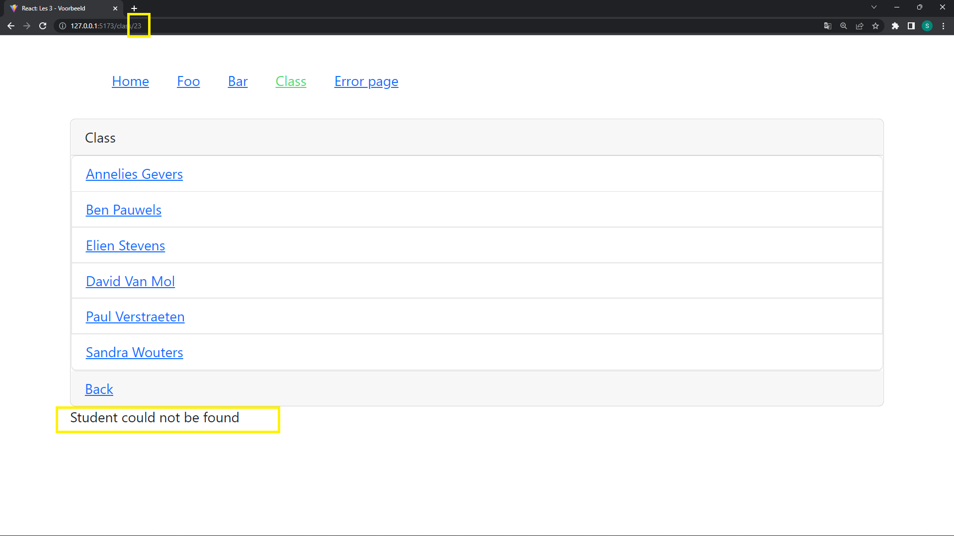 Momenteel toont de Students component nog steeds een foutmelding, dit is te verwachten aangezien we de navigatieparameter nog niet uitgelezen hebben. Dit kan via de useParams hook.